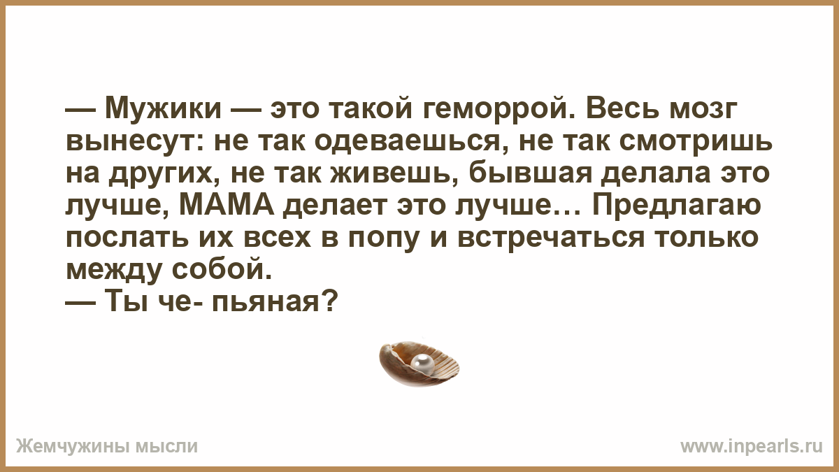 — Мужики — это такой геморрой. Весь мозг вынесут: не так одеваешься, не так смотришь на других, не так живешь, бывшая делала это лучше, МАМА делает это лучше… Предлагаю послать их всех в попу и встречаться только между собой.