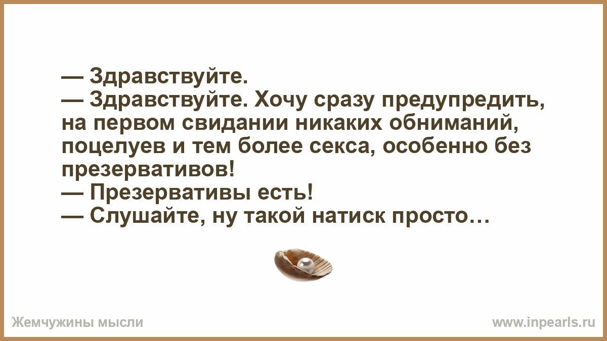 — Здравствуйте. Хочу сразу предупредить, на первом свидании никаких обниманий, поцелуев и тем более секса, особенно без презервативов!