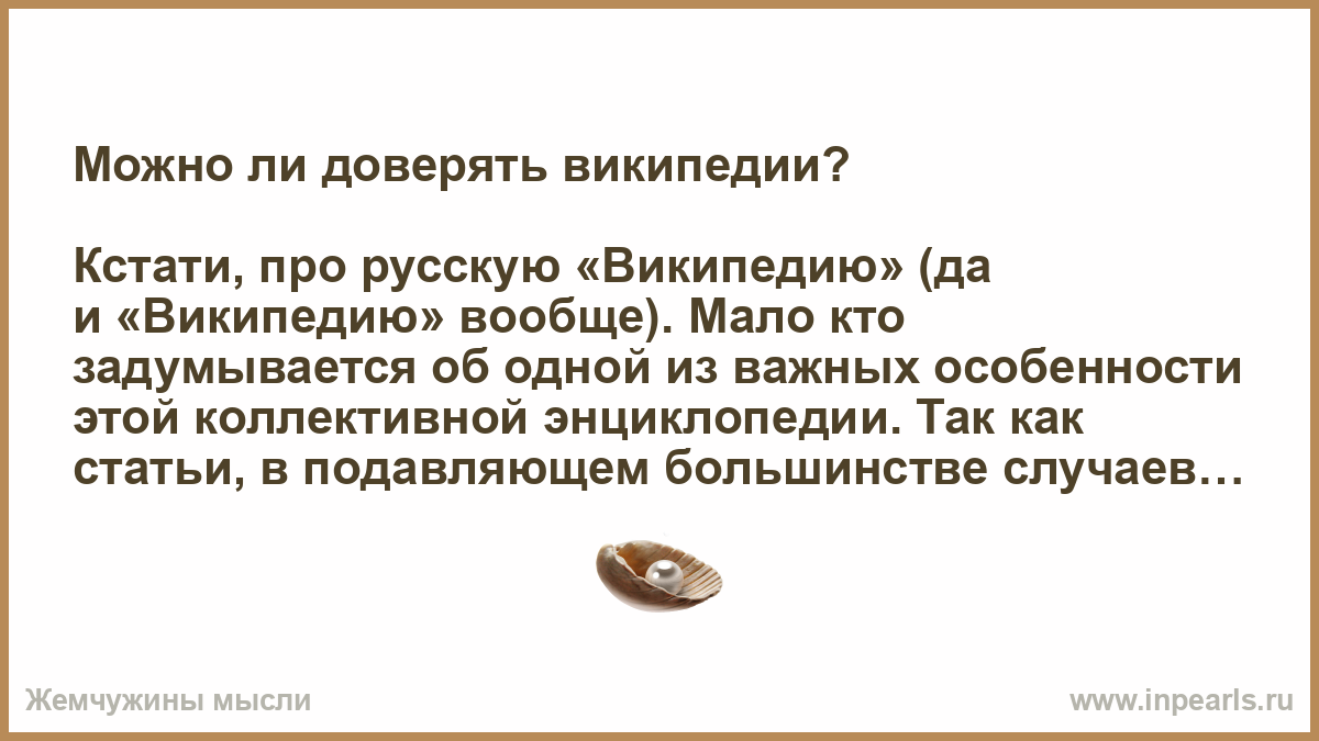 Кстати, про русскую «Википедию» (да и «Википедию» вообще). Мало кто задумывается об одной из важных особенности этой коллективной энциклопедии. Так как статьи, в подавляющем большинстве случаев, здесь пишут далеко не эксперты в затрагиваемом вопросе, то канву часто задают просто публикации в СМИ (ну на них принято ссылаться в «Вики»). Особенно это касается статей на актуальные и исторические темы.
