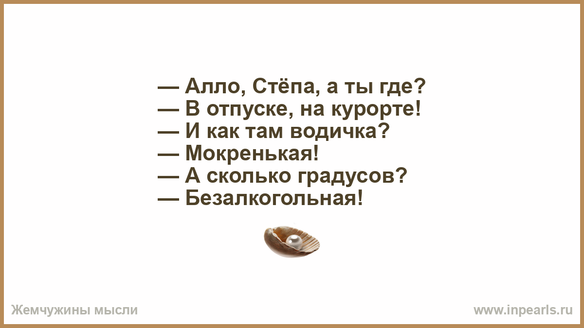— Алло, Стёпа, а ты где? — В отпуске, на курорте! — И как там водичка? — Мокренькая! — А сколько градусов? — Безалкогольная!
