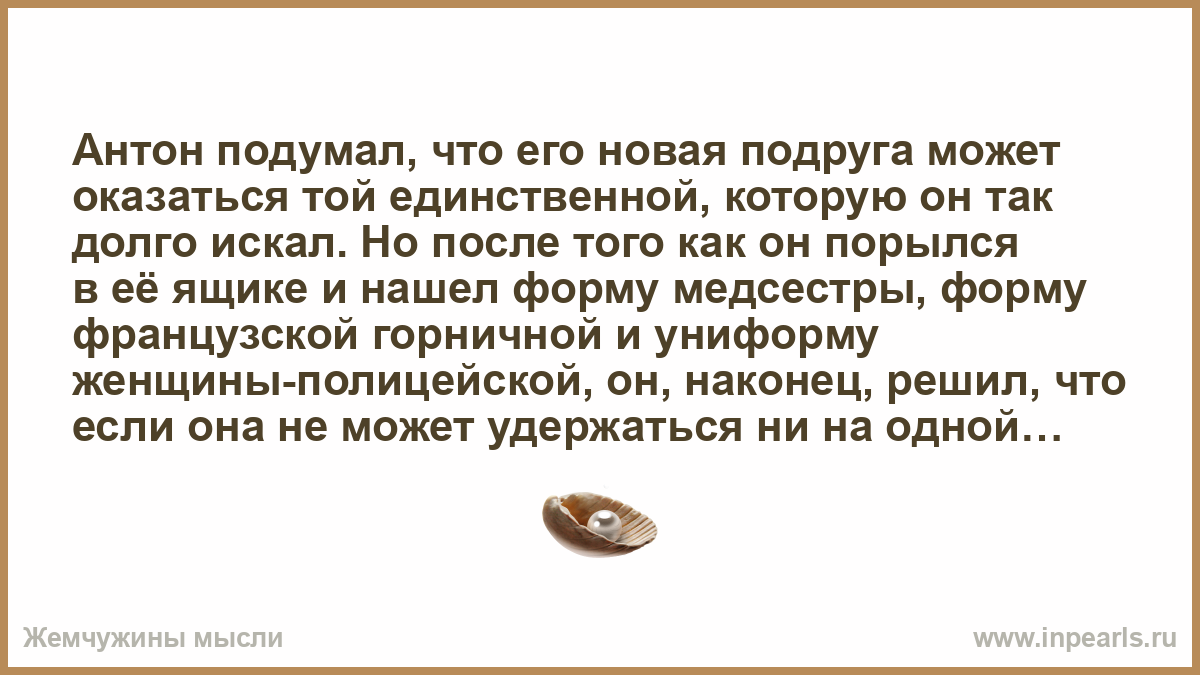 Антон подумал, что его новая подруга может оказаться той единственной, которую он так долго искал. Но после того как он порылся в её ящике и нашел форму медсестры, форму французской горничной и униформу женщины-полицейской, он, наконец, решил, что если она не может удержаться ни на одной работе, она не для него…