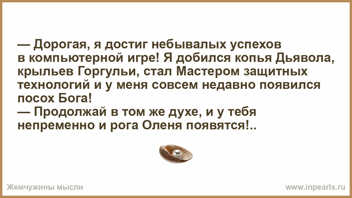 — Дорогая, я достиг небывалых успехов в компьютерной игре! Я добился копья Дьявола, крыльев Горгульи, стал Мастером защитных технологий и у меня совсем недавно появился посох Бога!