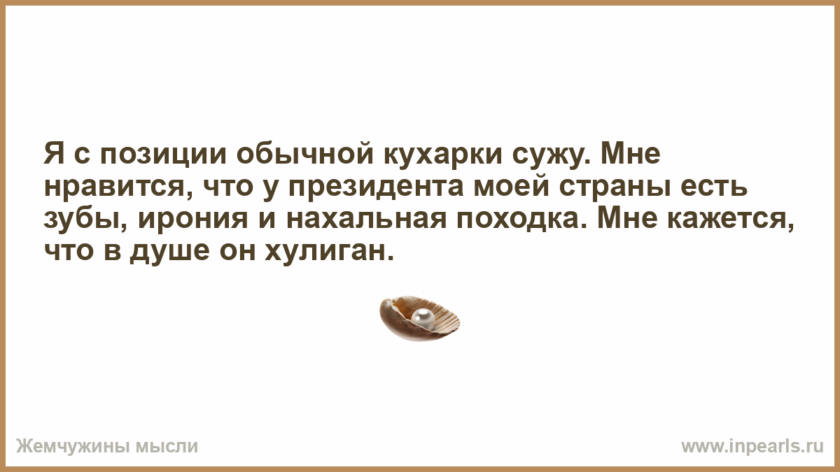 Я с позиции обычной кухарки сужу. Мне нравится, что у президента моей страны есть зубы, ирония и нахальная походка. Мне кажется, что в душе он хулиган.