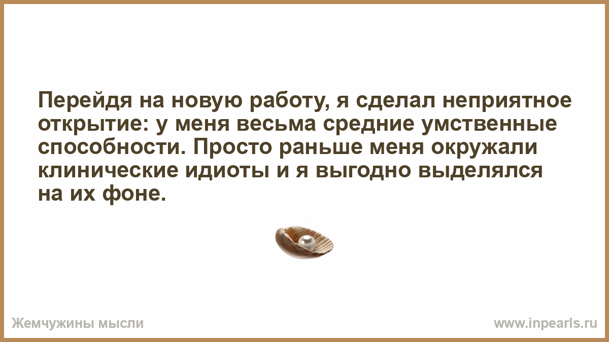 Перейдя на новую работу, я сделал неприятное открытие: у меня весьма средние умственные способности. Просто раньше меня окружали клинические идиоты и я выгодно выделялся на их фоне.