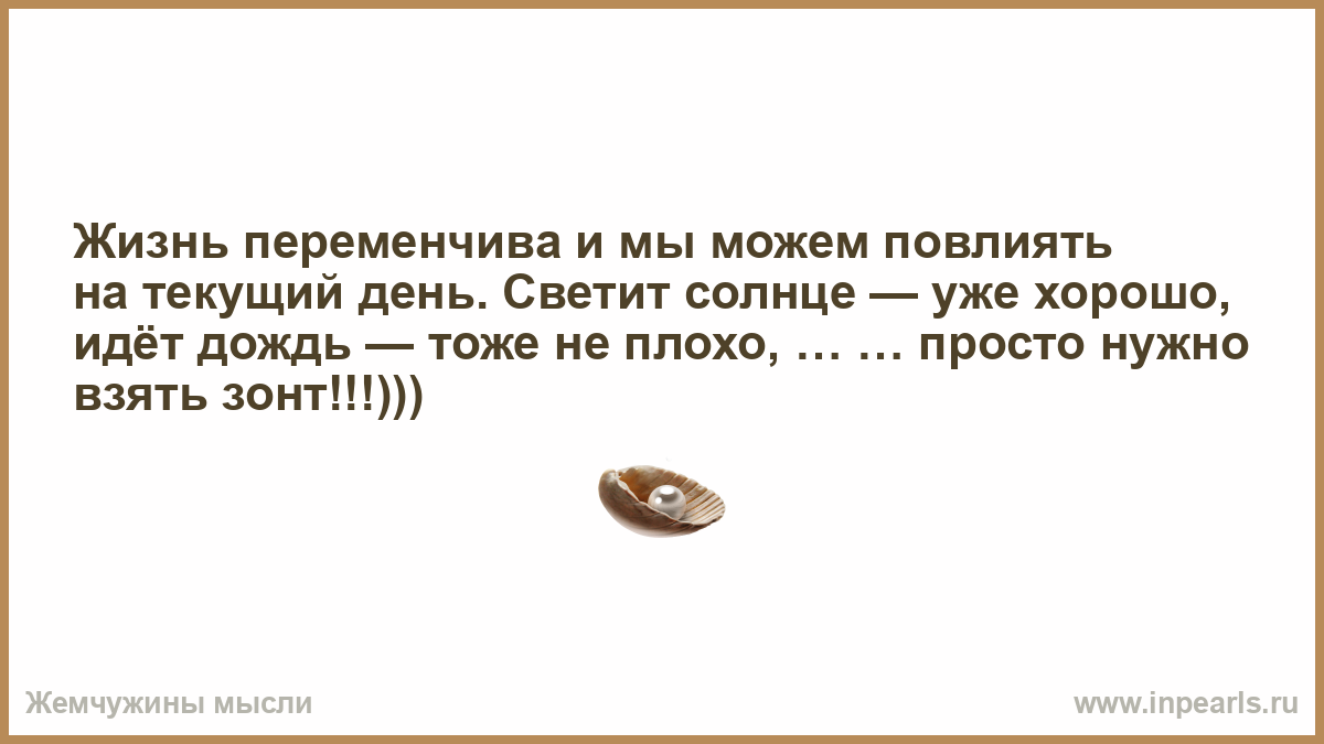 Жизнь переменчива и мы можем повлиять на текущий день. Светит солнце — уже хорошо, идёт дождь — тоже не плохо, … … просто нужно взять зонт!!!)))