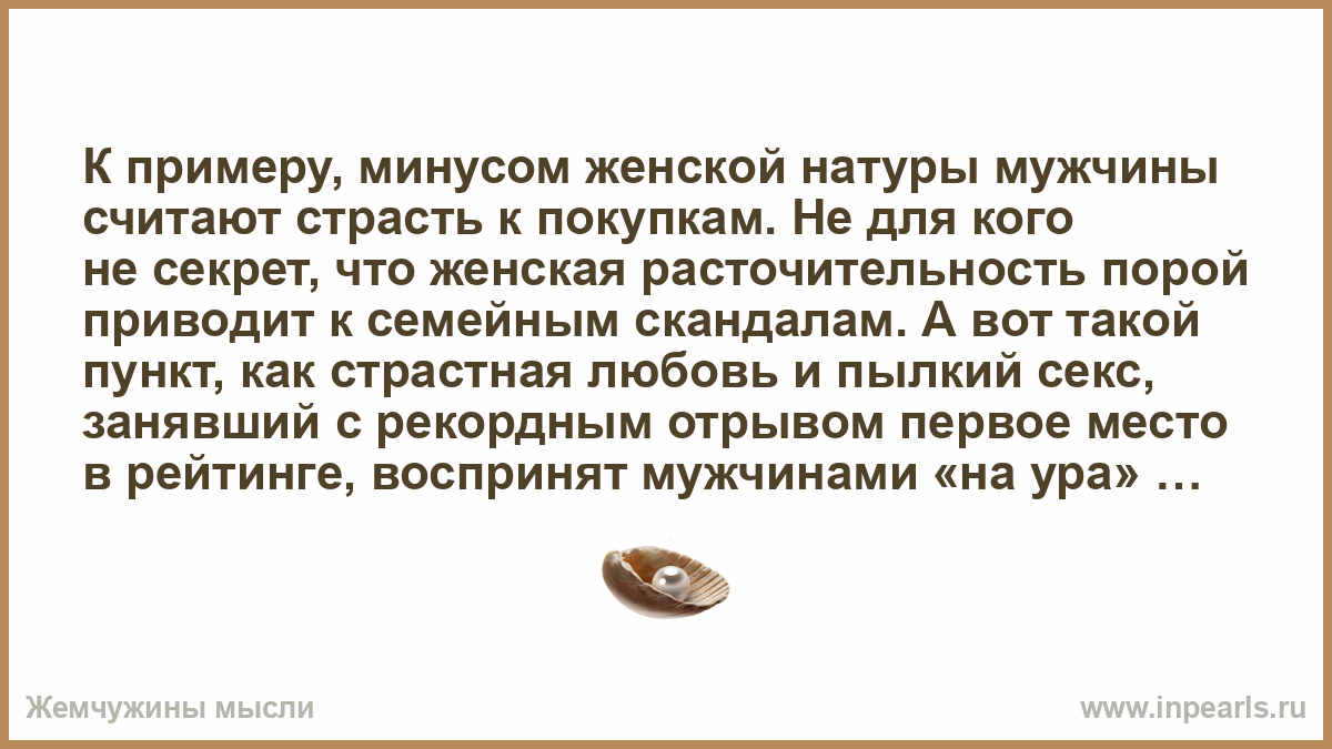 К примеру, минусом женской натуры мужчины считают страсть к покупкам. Не для кого не секрет, что женская расточительность порой приводит к семейным скандалам. А вот такой пункт, как страстная любовь и пылкий секс, занявший с рекордным отрывом первое место в рейтинге, воспринят мужчинами «на ура» — ведь представители мужской половины человечества считают, что все проблемы можно решить с помощью секса. Итак, какие же женские страсти мужчины считают недостатками? Секреты несовместимости мужской и женской психологий мы попробуем раскрыть в этой главе.