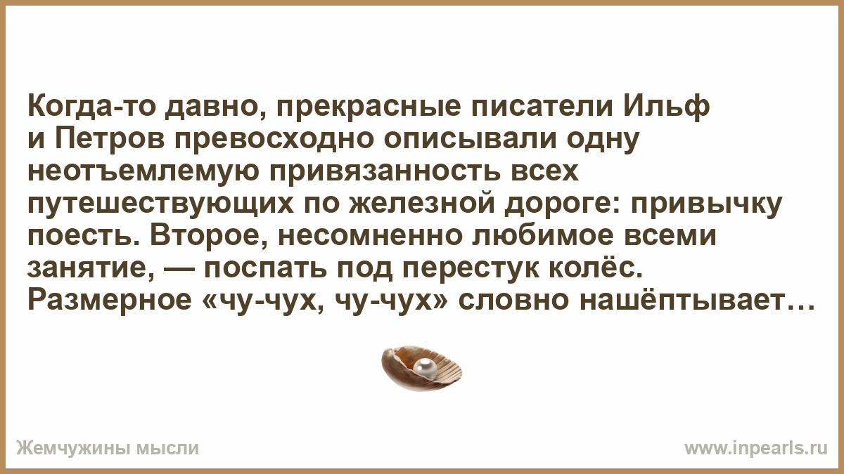 Когда-то давно, прекрасные писатели Ильф и Петров превосходно описывали одну неотъемлемую привязанность всех путешествующих по железной дороге: привычку поесть. Второе, несомненно любимое всеми занятие, — поспать под перестук колёс. Размерное «чу-чух, чу-чух» словно нашёптывает в уши пассажирам: «ты так устал, впереди ещё много долгих и скучных километров пути… приляг на полку и отдохни». И так велика власть волшебного чу-чуха над человеком, что даже сидя мы теряем контроль над ситуацией, голова свешивается на грудь, и мы проваливаемся в сладкий сон.