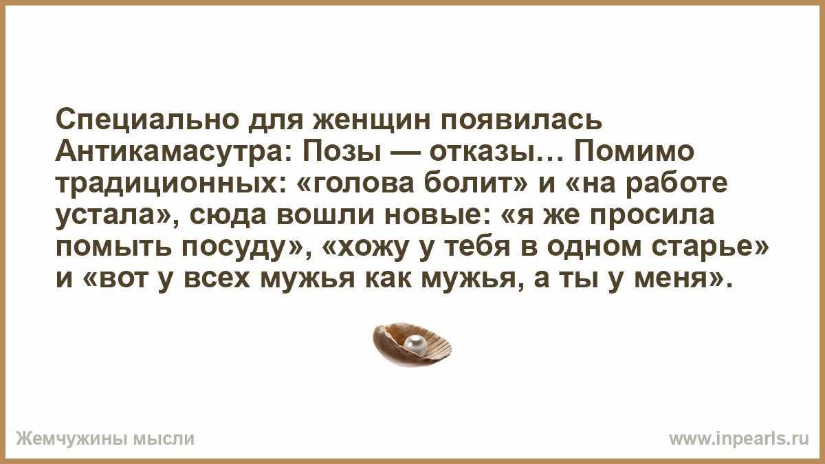 Специально для женщин появилась Антикамасутра: Позы — отказы… Помимо традиционных: «голова болит» и «на работе устала», сюда вошли новые: «я же просила помыть посуду», «хожу у тебя в одном старье» и «вот у всех мужья как мужья, а ты у меня».