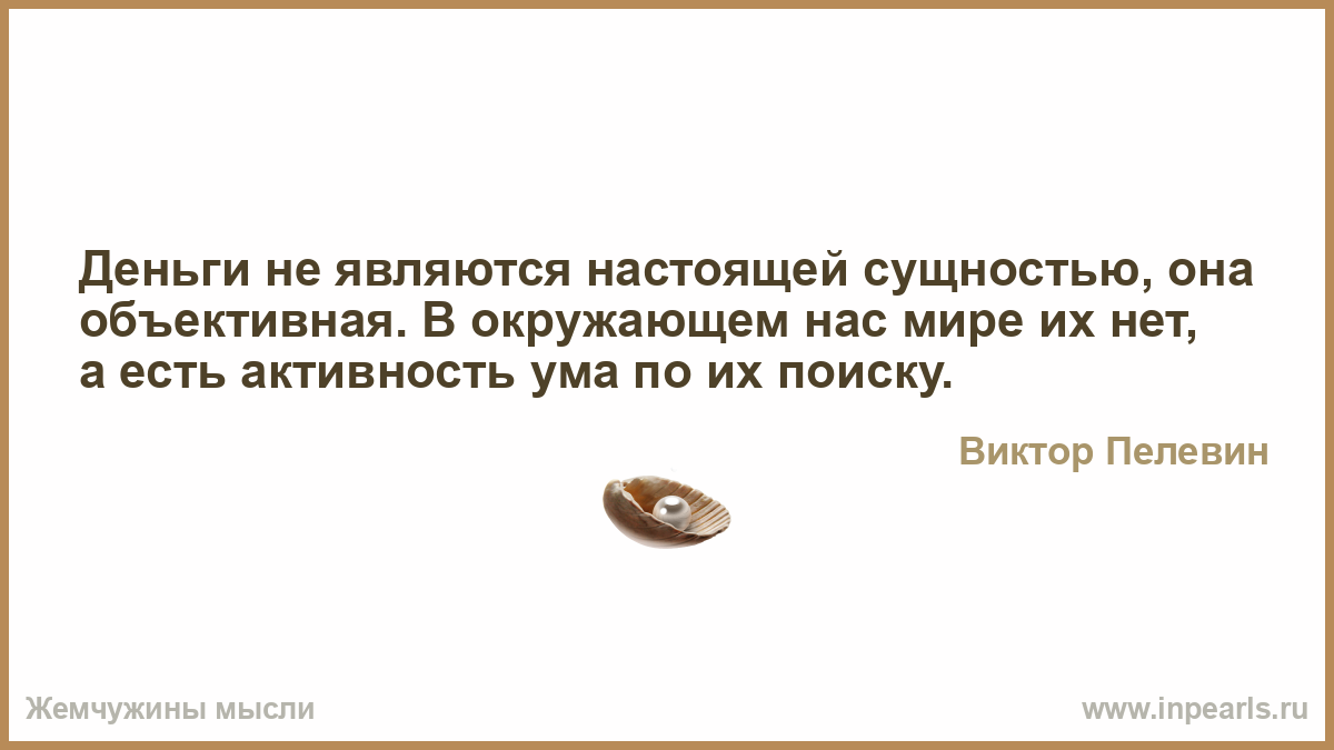 Деньги не являются настоящей сущностью, она объективная. В окружающем нас мире их нет, а есть активность ума по их поиску.