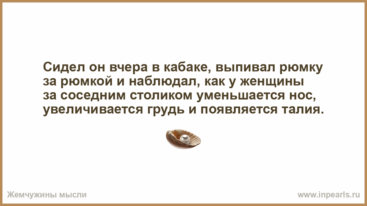 Сидел он вчера в кабаке, выпивал рюмку за рюмкой и наблюдал, как у женщины за соседним столиком уменьшается нос, увеличивается грудь и появляется талия.