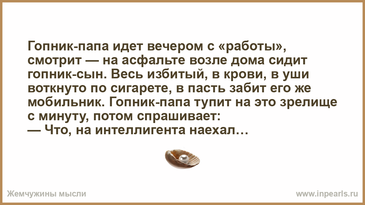 Гопник-папа идет вечером с «работы», смотрит — на асфальте возле дома сидит гопник-сын. Весь избитый, в крови, в уши