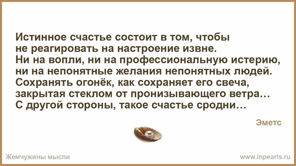 Истинное счастье состоит в том, чтобы не реагировать на настроение извне. Ни на вопли, ни на профессиональную истерию, ни на непонятные желания непонятных людей. Сохранять огонёк, как сохраняет его свеча, закрытая стеклом от пронизывающего ветра… С другой стороны, такое счастье сродни счастью тихого сумасшедшего в палате для буйных.