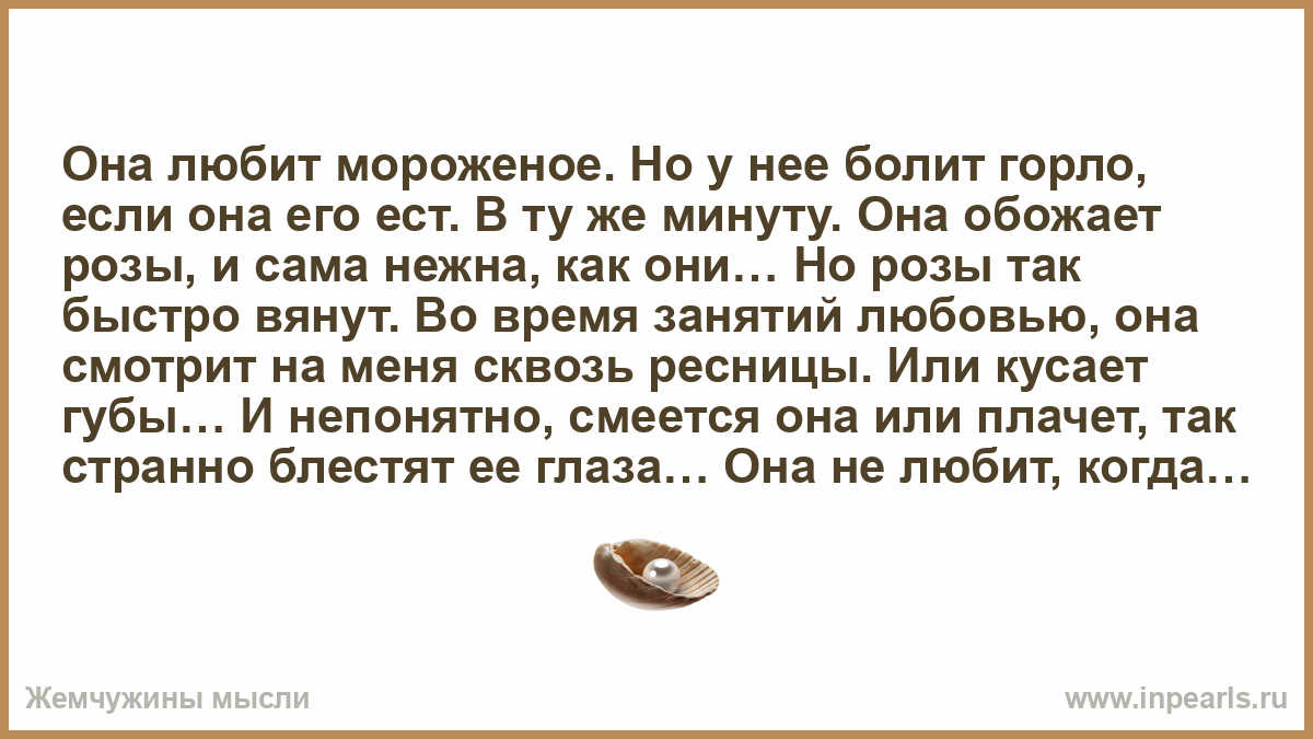 Она любит мороженое. Но у нее болит горло, если она его ест. В ту же минуту. Она обожает розы, и сама нежна, как они… Но розы так быстро вянут. Во время занятий любовью, она смотрит на меня сквозь ресницы. Или кусает губы… И непонятно, смеется она или плачет, так странно блестят ее глаза… Она не любит, когда я медлю, вычерчивая ее, словно длинную арабскую строфу, но и когда я молнией сливаюсь с ее вздохом, она немного дразнит меня, обводя нежным пальцем линию моих губ…