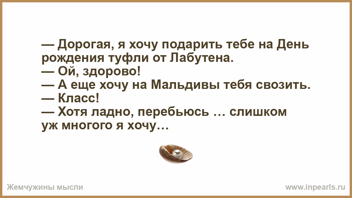 — Дорогая, я хочу подарить тебе на День рождения туфли от Лабутена. — Ой, здорово! — А еще хочу на Мальдивы тебя свозить. — Класс! — Хотя ладно, перебьюсь … слишком уж многого я хочу…