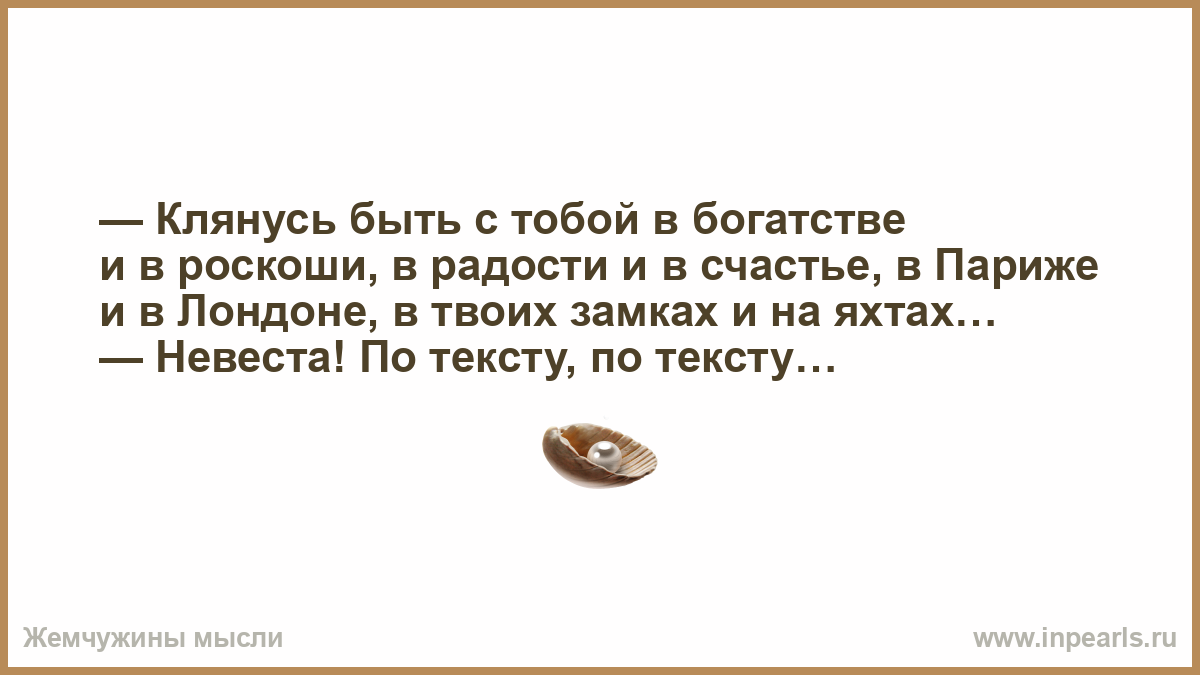 — Клянусь быть с тобой в богатстве и в роскоши, в радости и в счастье, в Париже и в Лондоне, в твоих замках и на яхтах… — Невеста! По тексту, по тексту…