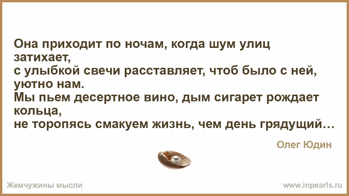 Его жена внезапно умерла… А он сидел до самого восхода, Все повторяя: «Как же ты могла?!» Перебирая вещи из комода… Глядел на тонкий шелк и кружева, Лет пять лежали вещи — не носила, «Все берегла… пока была жива… Куском обычной ткани дорожила… На всякий случай… Вот он и пришел! Загадываешь чуда, ждешь, мечтаешь… А кто-то взял… и за руку увёл! Особый случай — день, что проживаешь! Не оставлять на завтра! Жить сейчас! И не беречь посуду и одежду! Не доедать, не прятать про запас! И быть все время вместе, а не между… Беречь живой огонь любимых глаз, И каждый жест, и каждую улыбку, Все узелки, что связывают вас… Чтоб не жалеть, что совершил ошибку…»