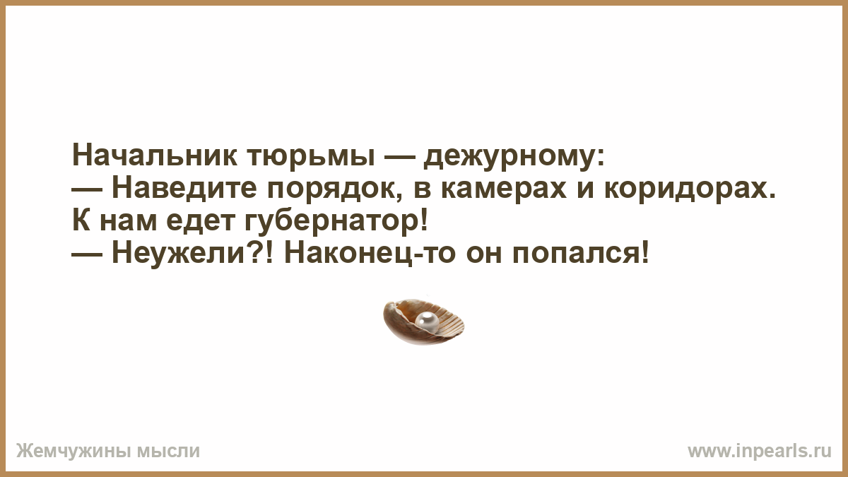 Начальник тюрьмы — дежурному: — Наведите порядок, в камерах и коридорах. К нам едет губернатор! — Неужели?! Наконец-то он попался!