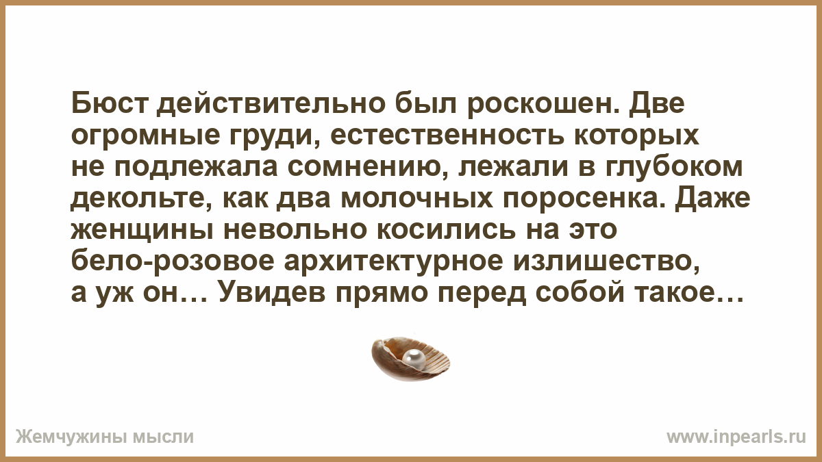Бюст действительно был роскошен. Две огромные груди, естественность которых не подлежала сомнению, лежали в глубоком декольте, как два молочных поросенка. Даже женщины невольно косились на это бело-розовое архитектурное излишество, а уж он… Увидев прямо перед собой такое богатство, он невнятно взвыл от восторга и вцепился в грудь обеими руками!