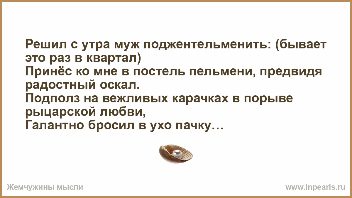 Решил с утра муж поджентельменить: (бывает это раз в квартал) Принёс ко мне в постель пельмени, предвидя радостный оскал. Подполз на вежливых карачках в порыве рыцарской любви, Галантно бросил в ухо пачку И прошептал:"Иди… вари!"