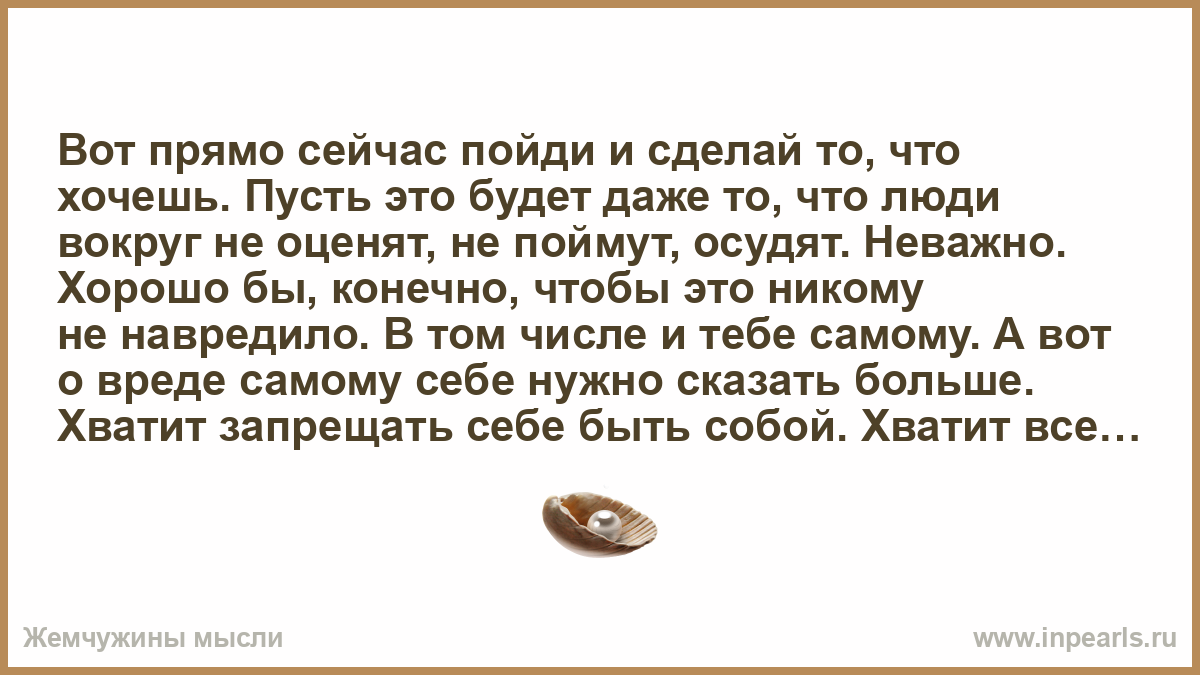 Вот прямо сейчас пойди и сделай то, что хочешь. Пусть это будет даже то, что люди вокруг не оценят, не поймут, осудят. Неважно. Хорошо бы, конечно, чтобы это никому не навредило. В том числе и тебе самому. А вот о вреде самому себе нужно сказать больше. Хватит запрещать себе быть собой. Хватит все анализировать, доверься себе. Хватит этих блоков, созданных разумом: «а что подумают?», «а что скажут?»! Не тормози себя. Хочется — иди и делай. Люди всё ищут самих себя. Да как же ты найдешь себя, если все время затыкаешь своему внутреннему «рот»? Ты сидишь там, глубоко, и не слышишь самого себя. Ты все смотришь в свое отражение вокруг, но никак не хочешь пойти короткой дорогой — вовнутрь. Когда ты ищешь себя вокруг, ты, конечно, находишь. В книгах, людях, фильмах. Но ты видишь только части себя. Ты весь внутри. Разреши себе говорить. Послушай себя. Чего ты действительно хочешь? Перестань запрещать себе. Разреши быть тому, чего ты хочешь. Делай то, что ты хочешь отныне и всегда. А когда ты найдешь себя, когда ты пойдешь дорогой своего света, улыбнись мне, даже если никогда меня не увидишь. Я все равно узнаю об этом.