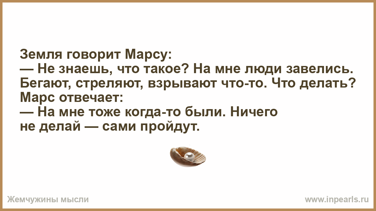 Земля говорит Марсу: — Не знаешь, что такое? На мне люди завелись. Бегают, стреляют, взрывают что-то. Что делать? Марс отвечает: — На мне тоже когда-то были. Ничего не делай — сами пройдут.