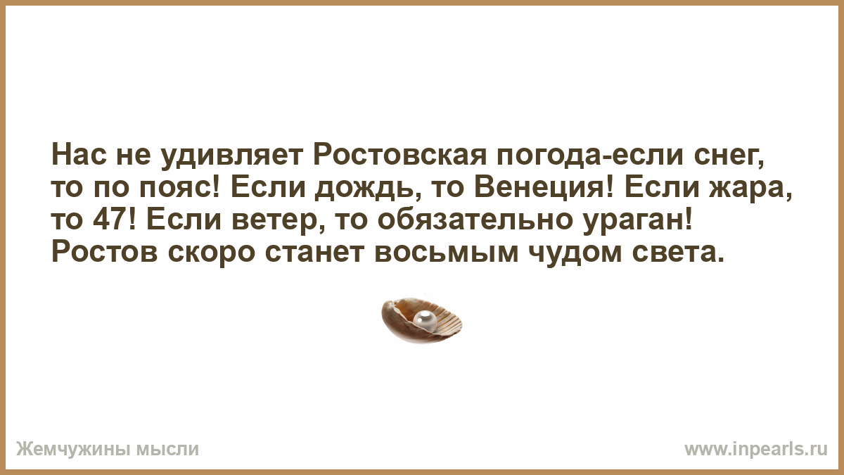 Нас не удивляет Ростовская погода-если снег, то по пояс! Если дождь, то Венеция! Если жара, то 47! Если ветер, то обязательно ураган! Ростов скоро станет восьмым чудом света.