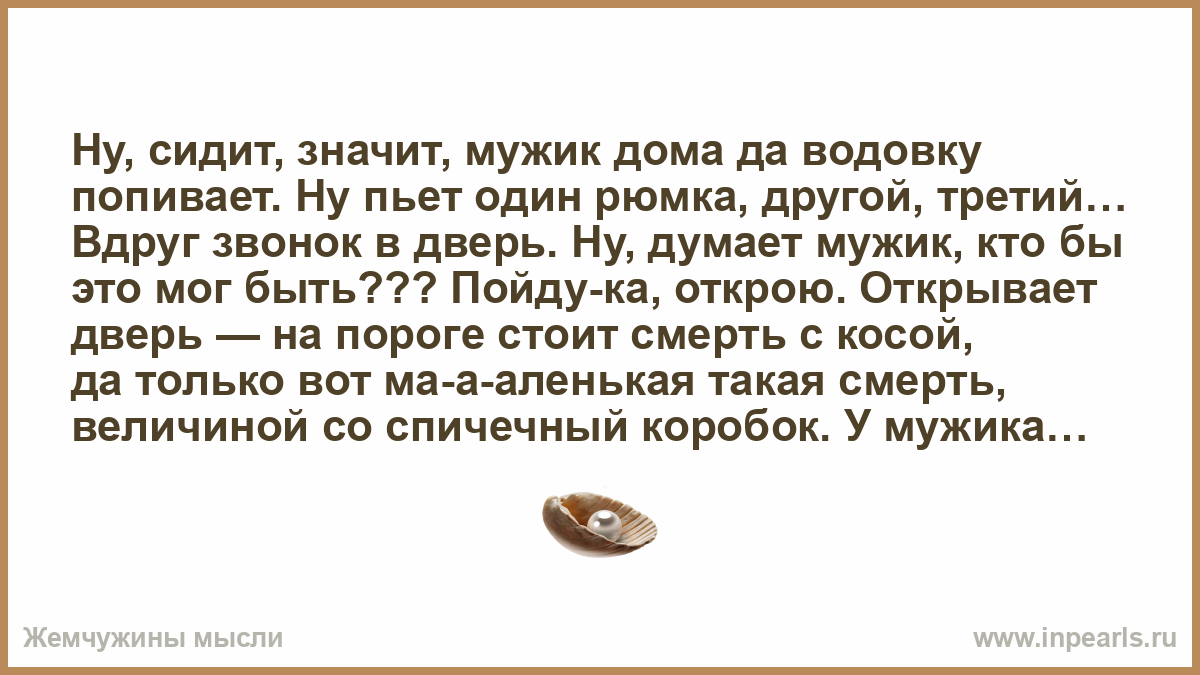 Ну, сидит, значит, мужик дома да водовку попивает. Ну пьет один рюмка, другой, третий… Вдруг звонок в дверь. Ну, думает мужик, кто бы это мог быть??? Пойду-ка, открою. Открывает дверь — на пороге стоит смерть с косой, да только вот ма-а-аленькая такая смерть, величиной со спичечный коробок. У мужика затряслись коленки, дар речи потерял, весь дрожит испугался, короче, сильно. — Да ты, мужик, не боись — я не к тебе, а к твоей канарейке !