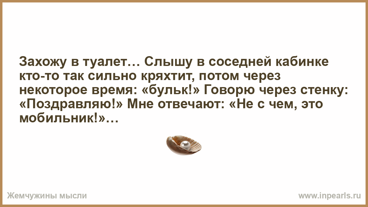 Захожу в туалет… Слышу в соседней кабинке кто-то так сильно кряхтит, потом через некоторое время: «бульк!» Говорю через стенку: «Поздравляю!» Мне отвечают: «Не с чем, это мобильник!»…