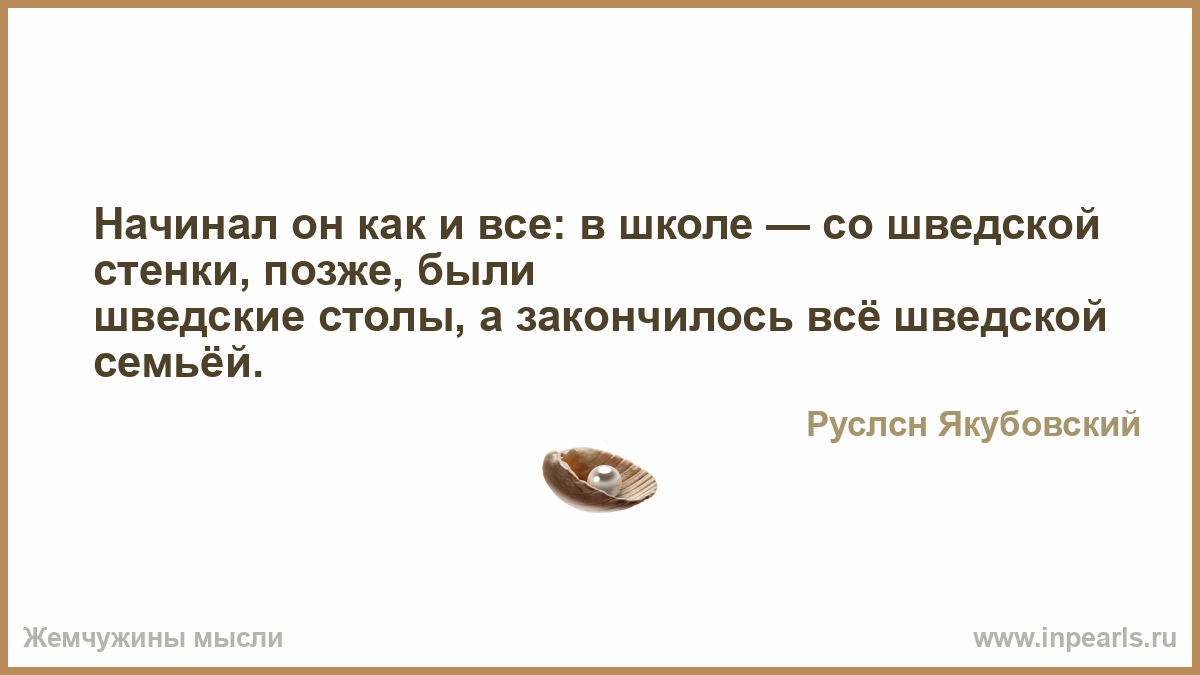 Начинал он как и все: в школе — со шведской стенки, позже, были шведские столы, а закончилось всё шведской семьёй.