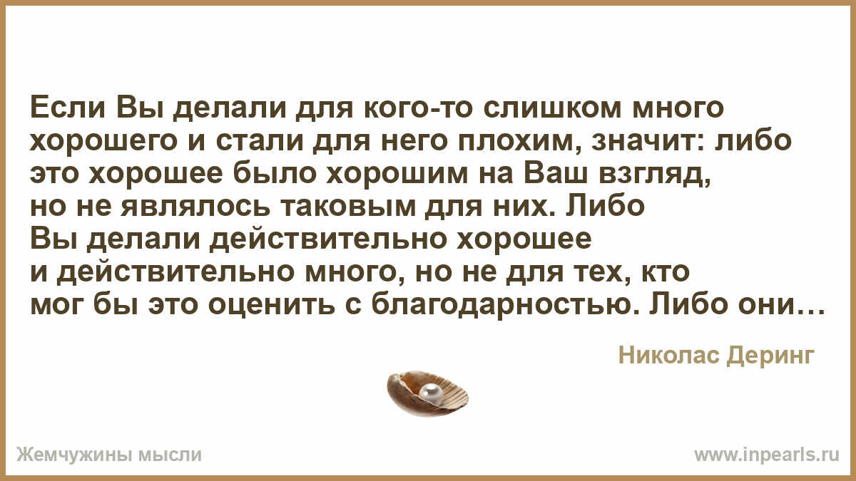 Если Вы делали для кого-то слишком много хорошего и стали для него плохим, значит: либо это хорошее было хорошим на Ваш взгляд, но не являлось таковым для них. Либо Вы делали действительно хорошее и действительно много, но не для тех, кто мог бы это оценить с благодарностью. Либо они просто не готовы быть благодарными и такими же добрыми как Вы и поэтому, чтобы сохранить психологический комфорт, они уничтожают для себя Вас, как объект проявляющий своей добротой их душевную слабость, когда даже на долю этой Вашей доброты они не способны. Либо же «они» просто не хотят быть Вам обязанными и не хотят отвечать Вам даже подобием того хорошего, что Вы действительно для них сделали, т. е. не хотят Вам «платить». Либо Ваше «хорошее» было слишком навязчивым и избыточным или же просто неуместным. А возможно, Вы просто развратили человека или даже людей добром и они хотят уже большего от Вас, но Вы уже не способны или не хотите им это дать.