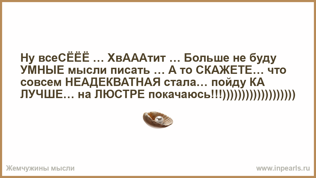 Ну всеСЁЁЁ … ХвАААтит … Больше не буду УМНЫЕ мысли писать … А то СКАЖЕТЕ… что совсем НЕАДЕКВАТНАЯ стала… пойду КА ЛУЧШЕ… на ЛЮСТРЕ покачаюсь!!!)))))))))))))))))))