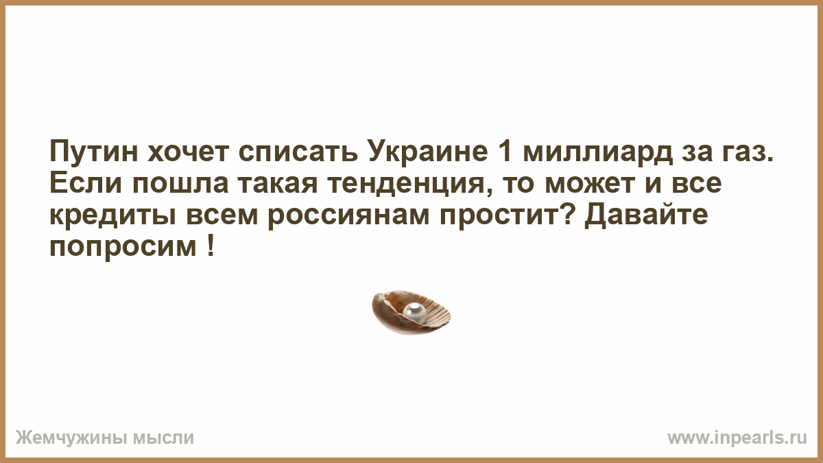 Путин хочет списать Украине 1 миллиард за газ. Если пошла такая тенденция, то может и все кредиты всем россиянам простит? Давайте попросим !