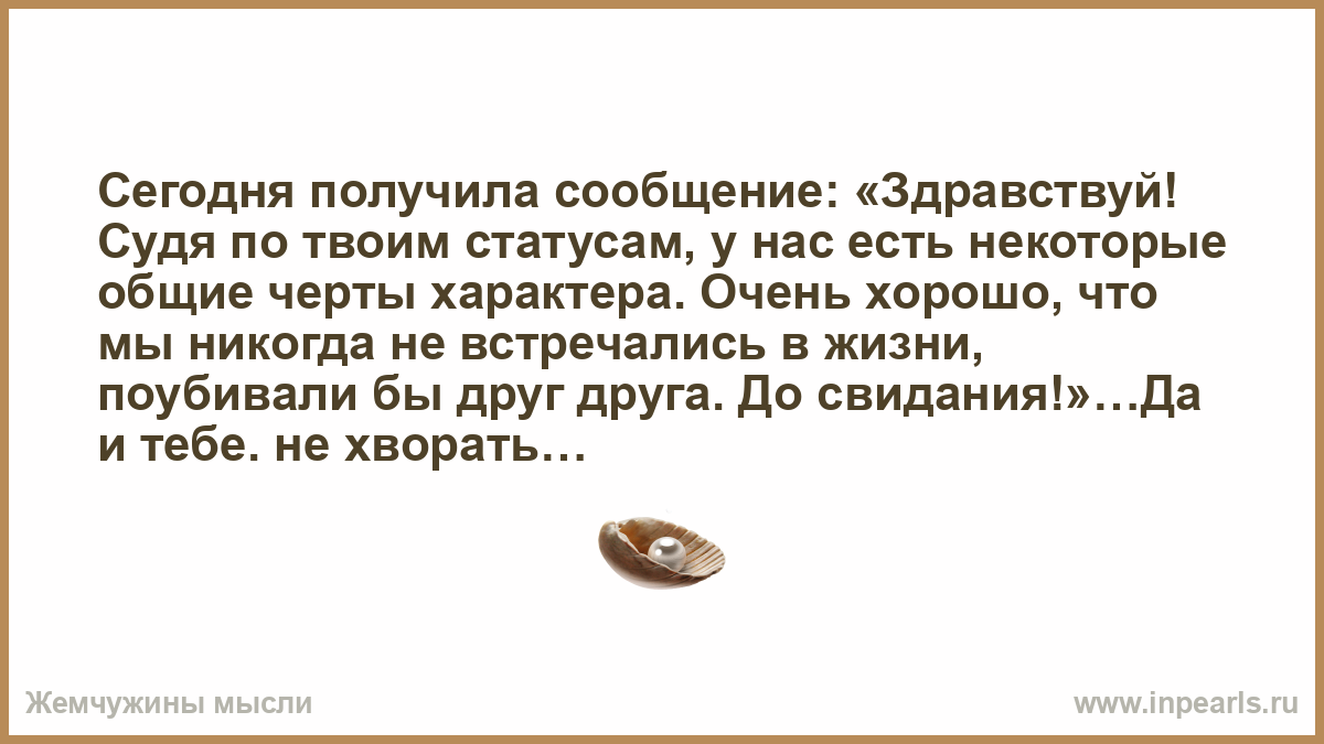 Сегодня получила сообщение: «Здравствуй! Судя по твоим статусам, у нас есть некоторые общие черты характера. Очень хорошо, что мы никогда не встречались в жизни, поубивали бы друг друга. До свидания!»…Да и тебе. не хворать…