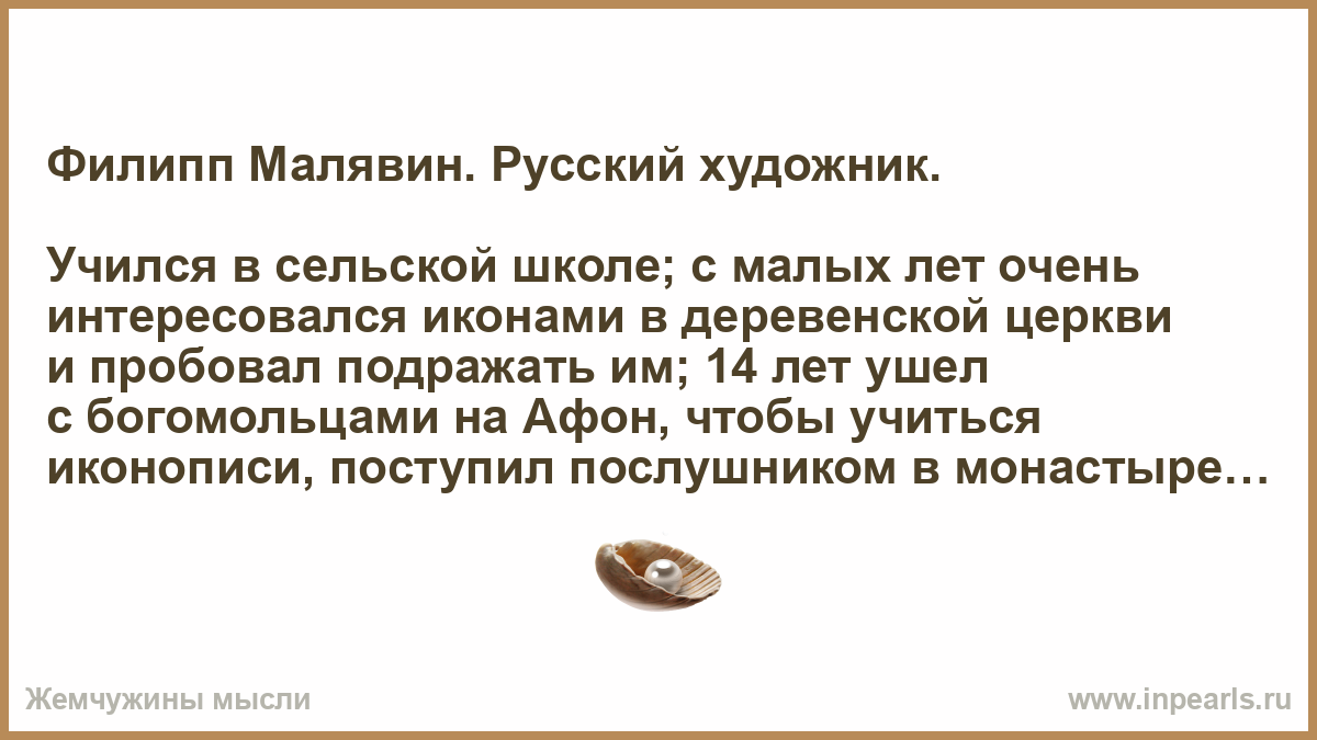 Учился в сельской школе; с малых лет очень интересовался иконами в деревенской церкви и пробовал подражать им; 14 лет ушел с богомольцами на Афон, чтобы учиться иконописи, поступил послушником в монастыре святого Пантелеймона, стал работать в иконописной мастерской и расписал стены небольшой церкви. В 1891 г. на Афон приехал скульптор В. А. Беклемишев, который увидел работы Малявина и был поражен его талантом. Вернувшись в Россию, Беклемишев разыскал Малявина в подворье Пантелеймоновского монастыря в Петербурге, поселил его у себя и подготовил к поступлению в Академию. В два года с выдающимся успехом Малявин прошел весь курс дореформенной Академии и начал выставлять на передвижных выставках. После реформы Академии Малявин решил остаться еще на некоторое время в мастерской Репина. В 1898 г. Малявин выступил на конкурс со своей картиной «Смех» и другими вещами, получил звание, но в заграничной командировке ему было отказано. В 1900 г. «Смех» был выставлен на всемирной выставке в Париже, где Малявину была присуждена золотая медаль; потом картина была выставлена в Венеции, где ее приобрело итальянское правительство для Венецианской Академии. По окончании Академии Малявин поселился в деревне, в Рязанской губернии, где построил себе мастерскую. Свои картины Малявин выставлял на выставках журнала «Мир Искусства», «36», «Союза», в «Салоне», на выставке, устроенной Дягилевым в Париже при «Salon d’Automne», на выставках «Secession» в Берлине и Мюнхене, в Риме, в Венеции. На всех этих выставках появлялись характерные малявинские «ба бы» в ярких, пестрых сарафанах, отличные портреты и рисунки. Кроме первой картины: «Смех», следует упомянуть «Вихрь» (1906), «Крестьянская девушка» (1899), «Баба» (1904), «Две бабы» (1905). Из портретов очень интересны: «Портрет Ники», «Семейный портрет», портреты И. Репина, К. Сомова, М. Нестерова. По характеру живописи Малявин стоит ближе к Бенару и Цорну, чем к Репину. «Таких красивых сочетаний красок, такой бравурности в технике, такой великолепной простоты и смелости не найти на всем протяжении истории русской живописи» (Александр Бенуа). В Третьяковской галерее находятся: «Крестьянская девушка», другая такая же, «Вихрь», «За книгой» и много рисунков; в Русском Музее Императора Александра III — «Баба»; другие произведения Малявина находятся в частных коллекциях за границей и в России. — См. И. Остроухов и С. Глаголь «Художественная галерея П. и С. Третьяковых»; Александр Бенуа «История русской живописи в XIX в.». С. Р-ва.