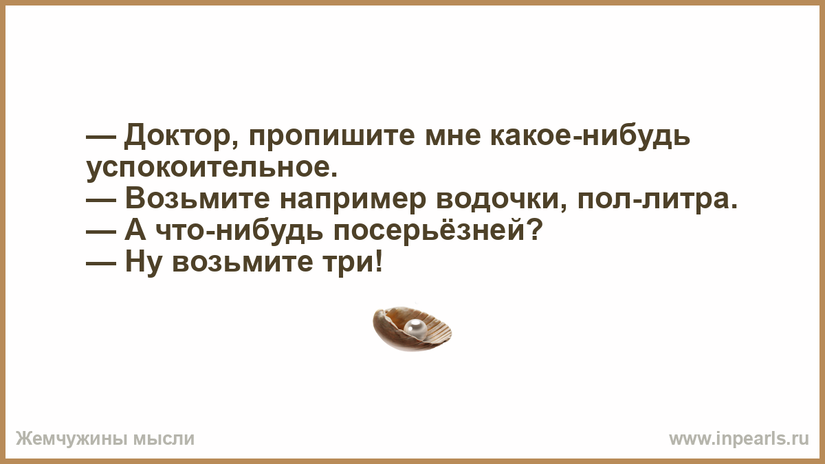 — Доктор, пропишите мне какое-нибудь успокоительное. — Возьмите например водочки, пол-литра. — А что-нибудь посерьёзней? — Ну возьмите три!