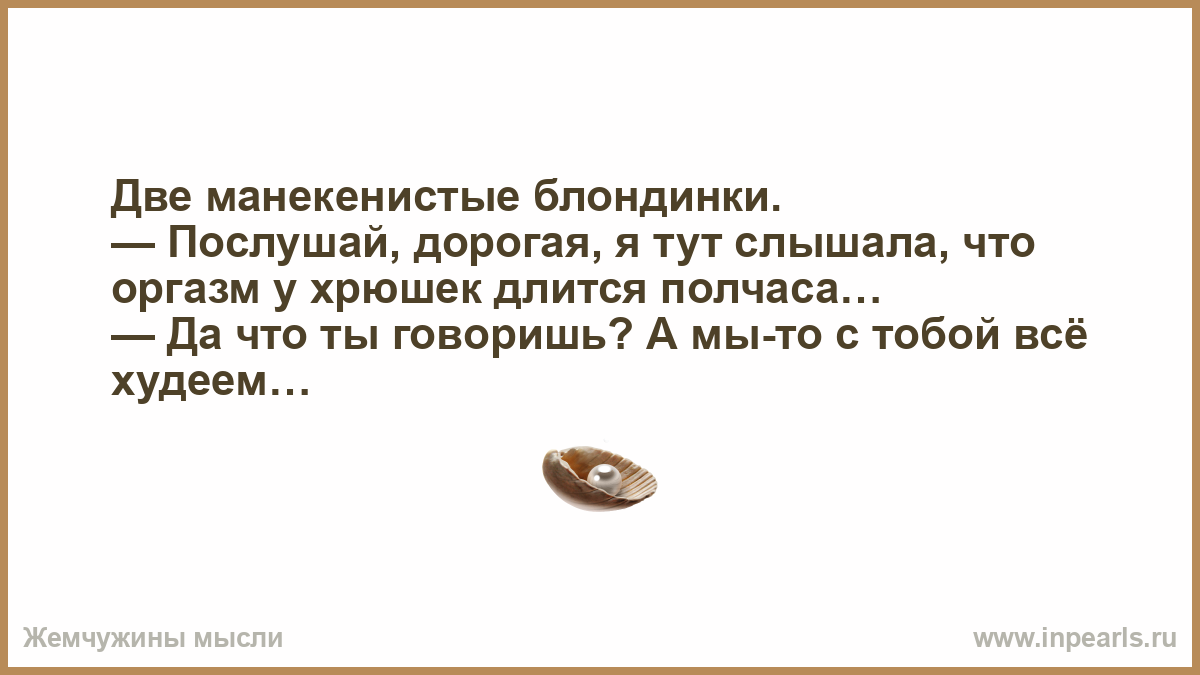 Две манекенистые блондинки. — Послушай, дорогая, я тут слышала, что оргазм у хрюшек длится полчаса… — Да что ты говоришь? А мы-то с тобой всё худеем…