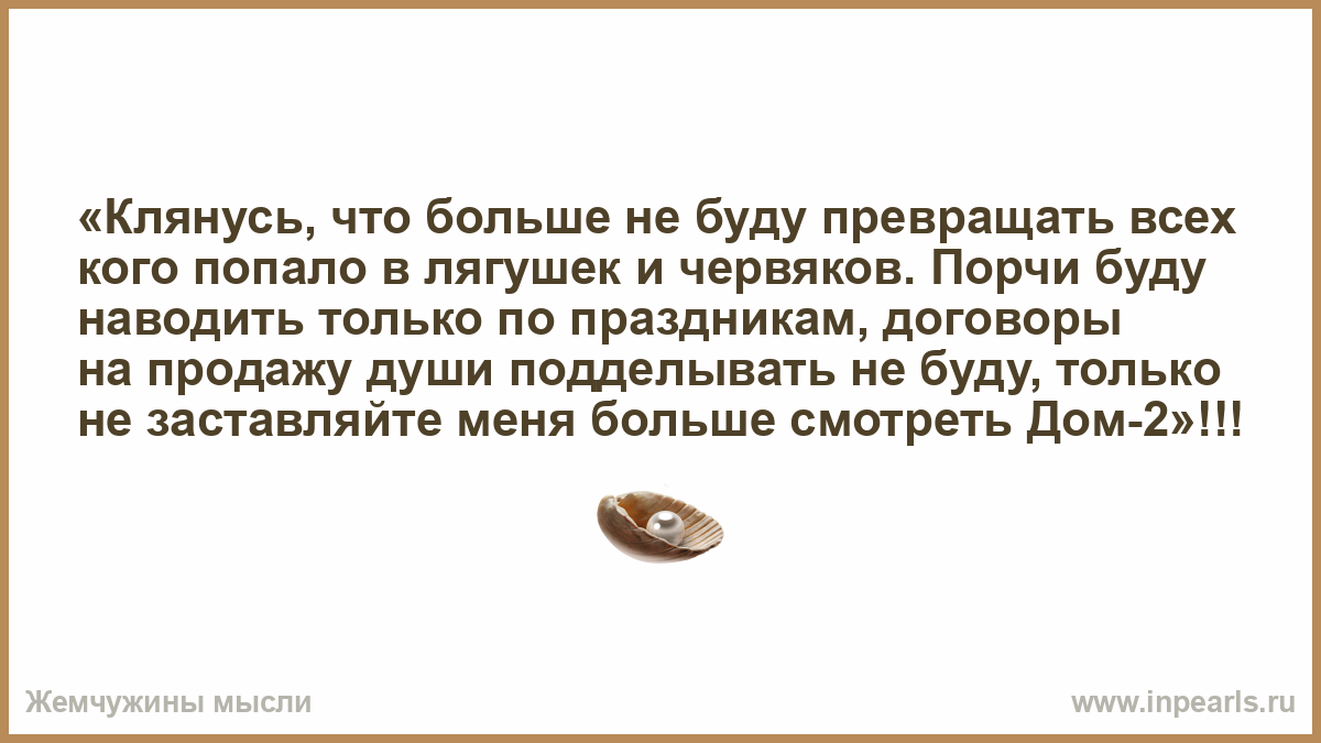 «Клянусь, что больше не буду превращать всех кого попало в лягушек и червяков. Порчи буду наводить только по праздникам, договоры на продажу души подделывать не буду, только не заставляйте меня больше смотреть Дом-2»!!!