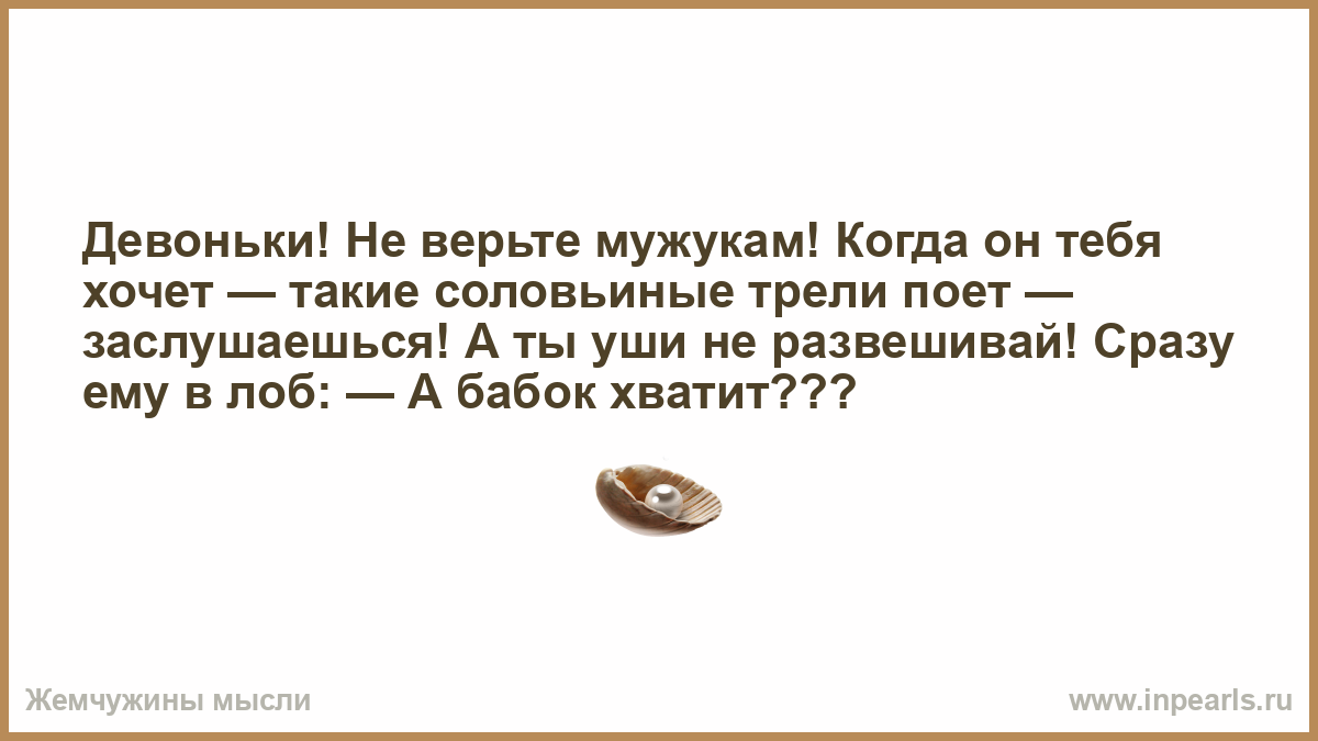 Девоньки! Не верьте мужукам! Когда он тебя хочет — такие соловьиные трели поет — заслушаешься! А ты уши не развешивай! Сразу ему в лоб: — А бабок хватит???