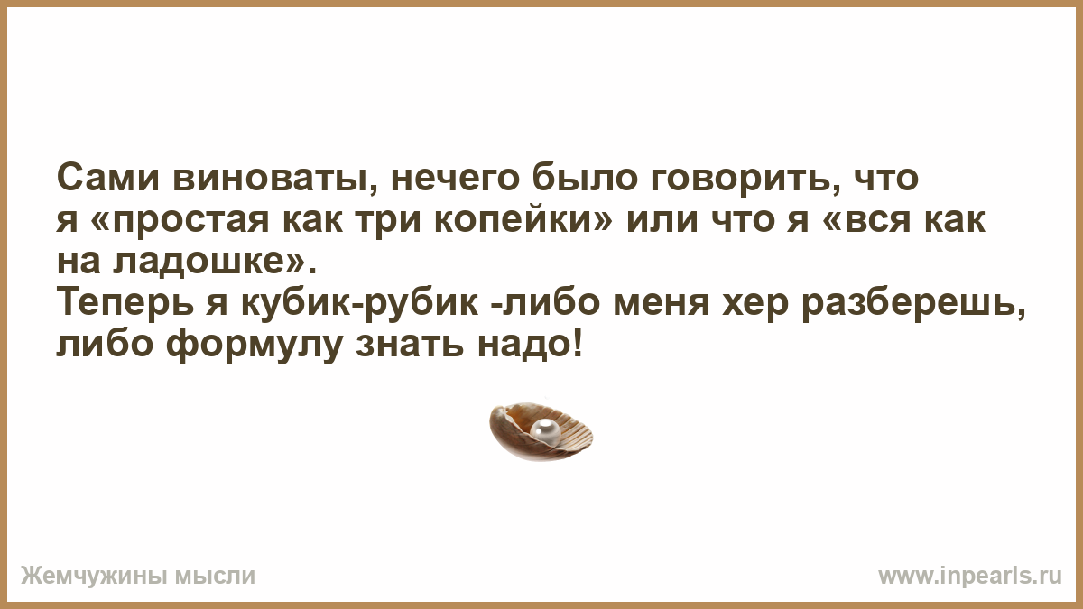 Сами виноваты, нечего было говорить, что я «простая как три копейки» или что я «вся как на ладошке». Теперь я кубик-рубик -либо меня хер разберешь, либо формулу знать надо!