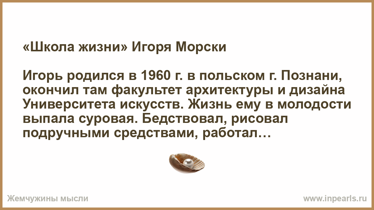 Игорь уже перешагнул полувековой рубеж жизни и может с уверенностью подводить некоторые итоги. Если прежде он был малоизвестным художником, чьими работами могли любоваться лишь сограждане-поляки, то теперь популярность художника вышла за пределы Польши и всё больше поклонников по всему миру отдают должное таланту и фантазии Морски.