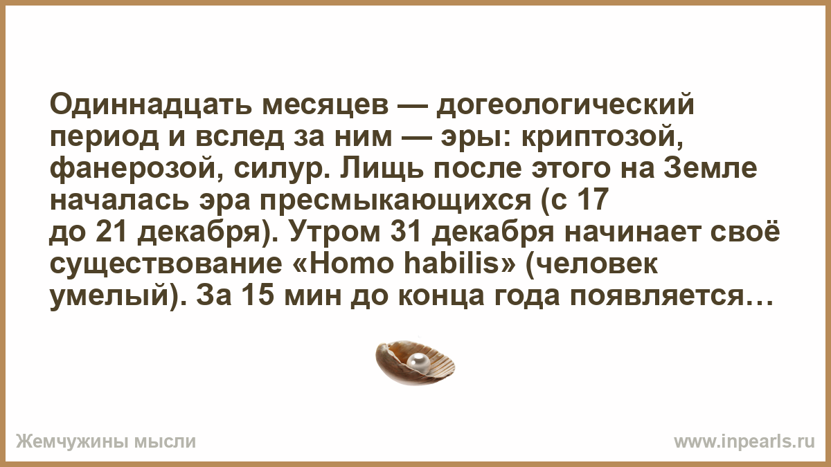Одиннадцать месяцев — догеологический период и вслед за ним — эры: криптозой, фанерозой, силур. Лищь после этого на Земле началась эра пресмыкающихся (с 17 до 21 декабря). Утром 31 декабря начинает своё существование «Homo habilis» (человек умелый). За 15 мин до конца года появляется «Homo sapiens» (человек разумный). Письменность возникла за 1,5 минуты до Нового года. А в космосе мы дали о себе знать не более 2−3 секунды тому назад (до Нового года).