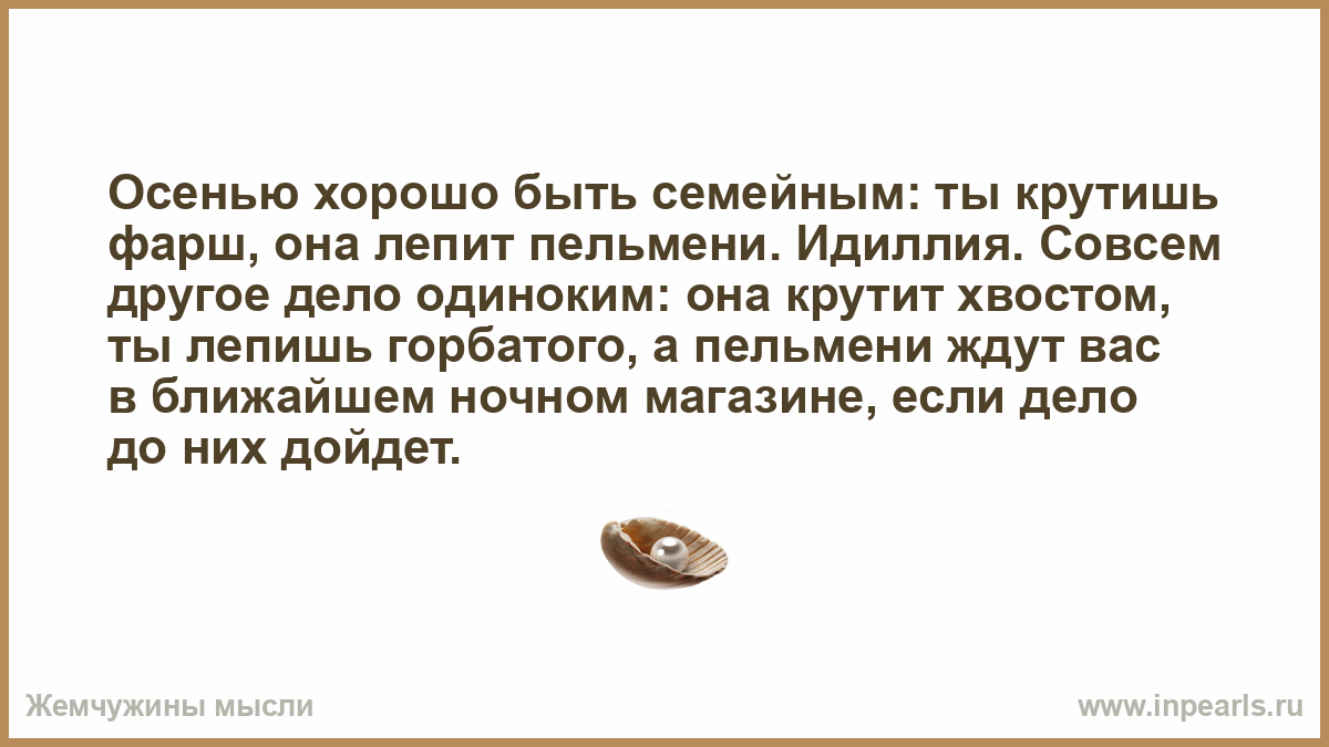 Осенью хорошо быть семейным: ты крутишь фарш, она лепит пельмени. Идиллия. Совсем другое дело одиноким: она крутит хвостом, ты лепишь горбатого, а пельмени ждут вас в ближайшем ночном магазине, если дело до них дойдет.