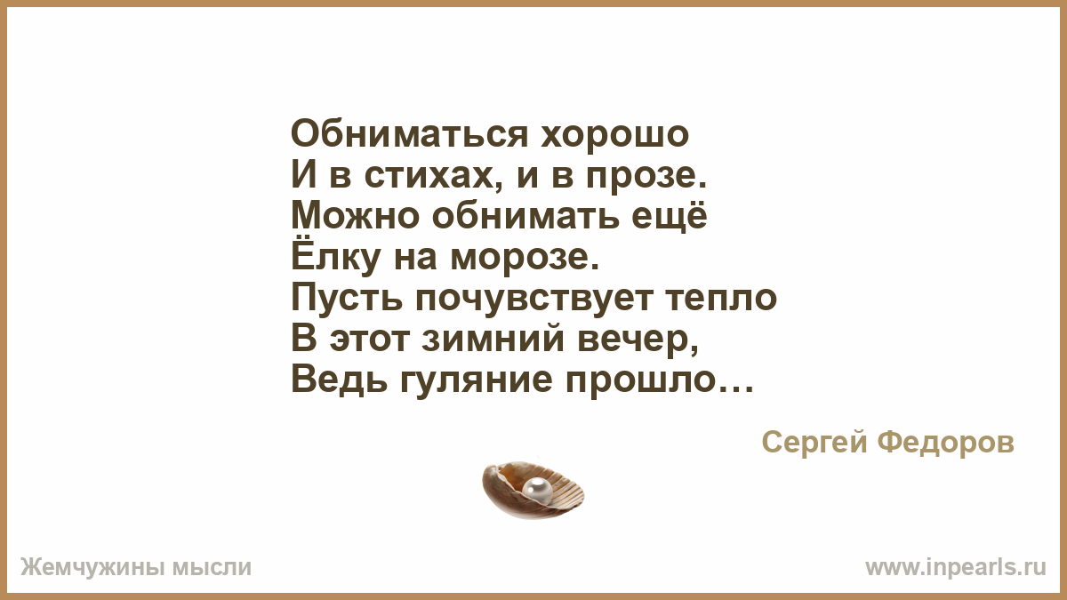 Обниматься хорошо И в стихах, и в прозе. Можно обнимать ещё Ёлку на морозе. Пусть почувствует тепло В этот зимний вечер, Ведь гуляние прошло, Ей укрыться нечем.