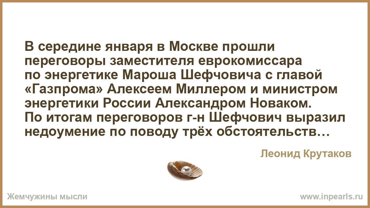 В середине января в Москве прошли переговоры заместителя еврокомиссара по энергетике Мароша Шефчовича с главой «Газпрома» Алексеем Миллером и министром энергетики России Александром Новаком. По итогам переговоров г-н Шефчович выразил недоумение по поводу трёх обстоятельств.