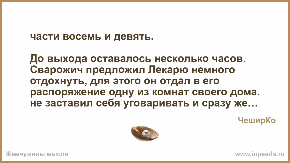 До выхода оставалось несколько часов. Сварожич предложил Лекарю немного отдохнуть, для этого он отдал в его распоряжение одну из комнат своего дома. не заставил себя уговаривать и сразу же растянулся на кровати.