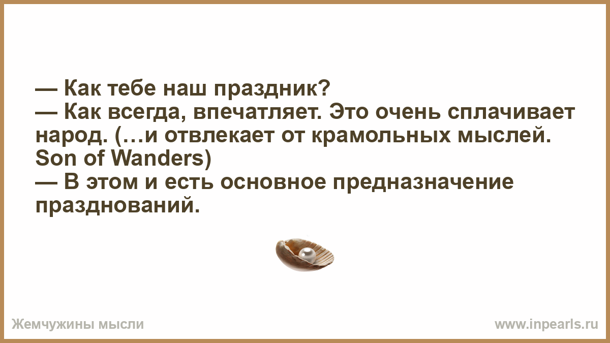 — Как всегда, впечатляет. Это очень сплачивает народ. (…и отвлекает от крамольных мыслей. Son of Wanders)