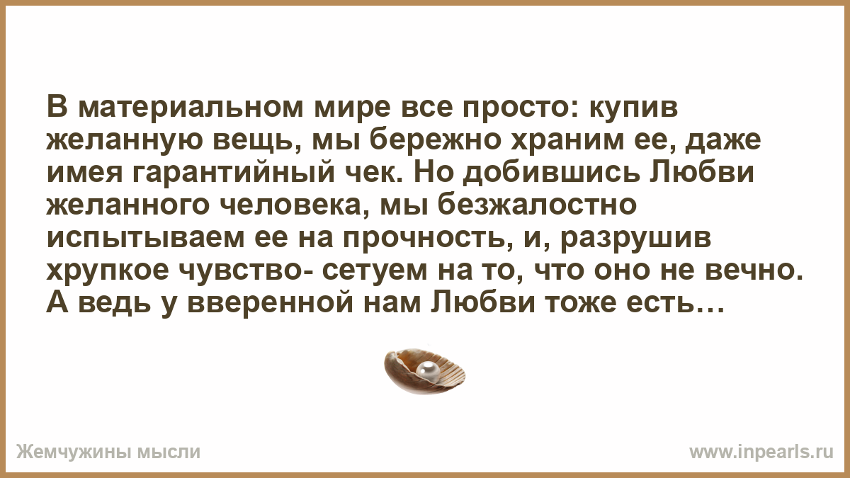 В материальном мире все просто: купив желанную вещь, мы бережно храним ее, даже имея гарантийный чек. Но добившись Любви желанного человека, мы безжалостно испытываем ее на прочность, и, разрушив хрупкое чувство- сетуем на то, что оно не вечно. А ведь у вверенной нам Любви тоже есть гарантийный чек- Доверие, не понимая ценность которого, мы легкомысленно теряем…