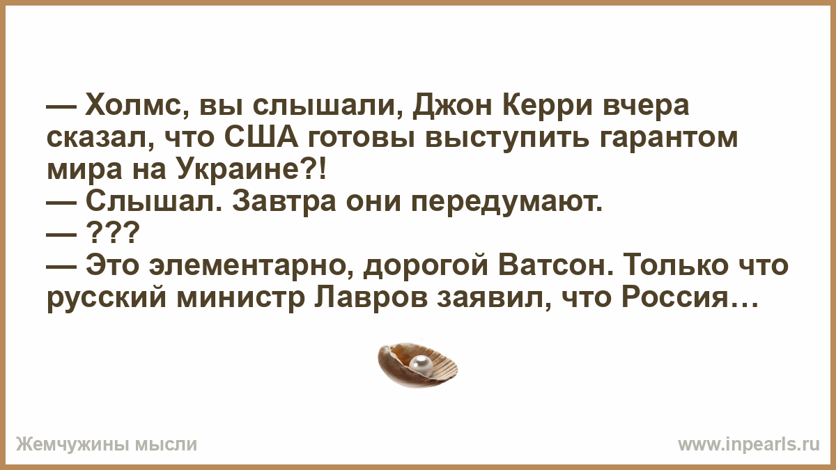 — Холмс, вы слышали, Джон Керри вчера сказал, что США готовы выступить гарантом мира на Украине?!