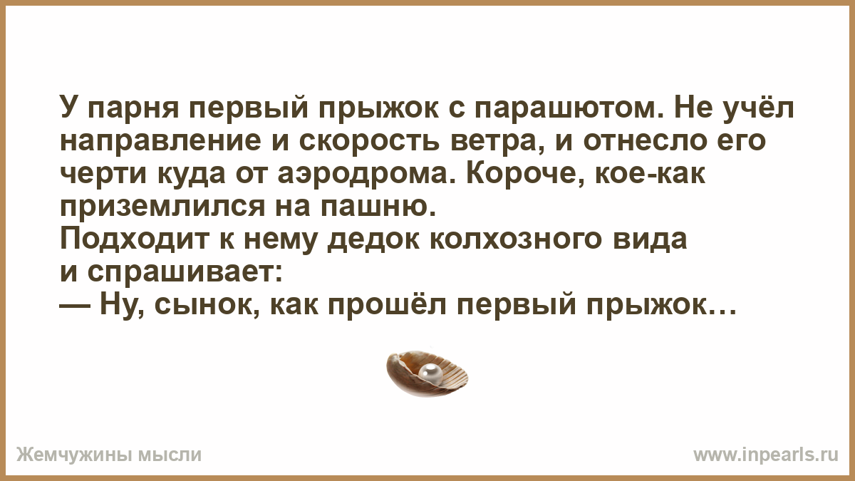 У парня первый прыжок с парашютом. Не учёл направление и скорость ветра, и отнесло его черти куда от аэродрома. Короче, кое-как приземлился на пашню.