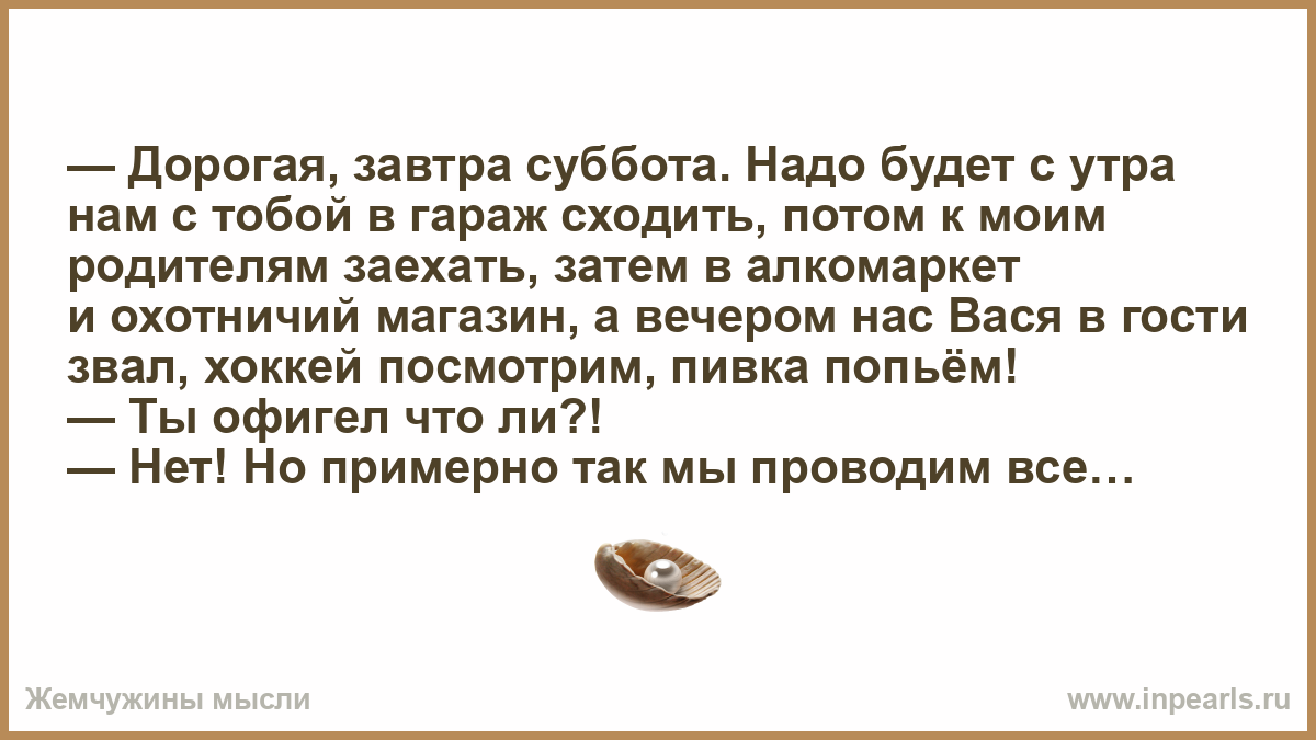 — Дорогая, завтра суббота. Надо будет с утра нам с тобой в гараж сходить, потом к моим родителям заехать, затем в алкомаркет и охотничий магазин, а вечером нас Вася в гости звал, хоккей посмотрим, пивка попьём!